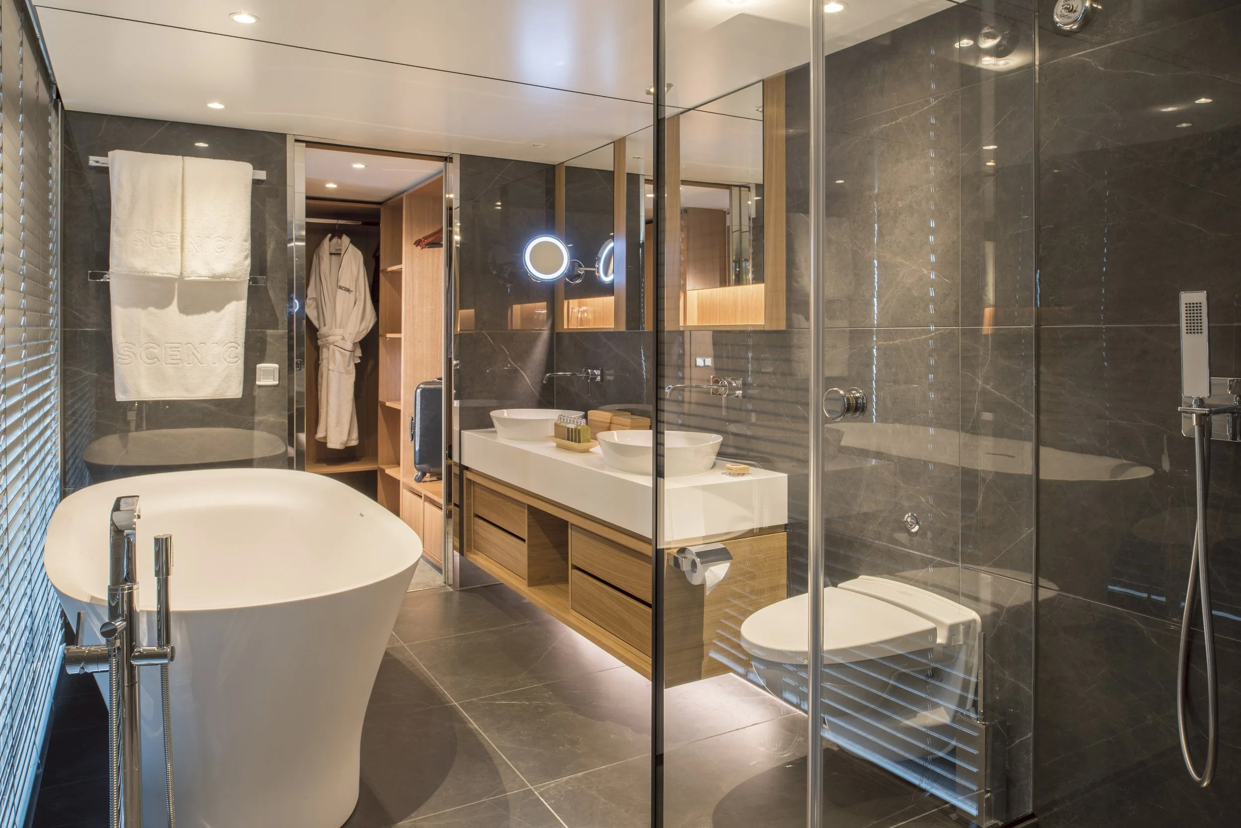 The largest suite on our Scenic Space-Ships, these indulgent sanctuaries are located on the Diamond Deck and include an impressive Scenic Sun Lounge, separate lounge area and oversized bathroom.